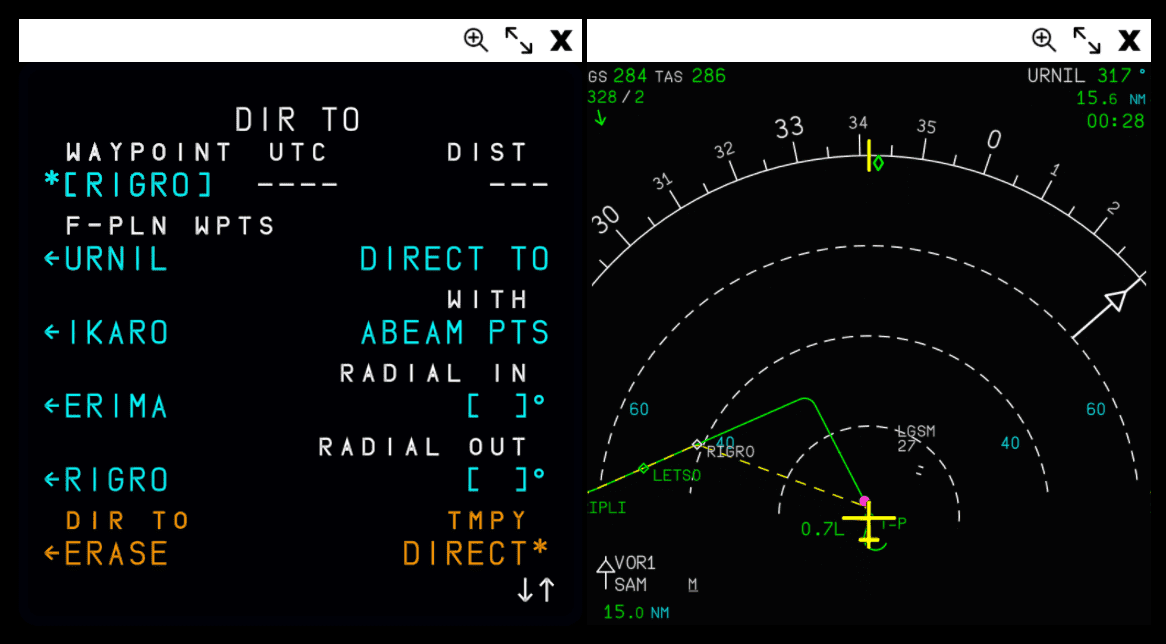 It is important to note that currently we are simulating the Thales version of the DIR TO page on our MCDU. We intend to change this at a later time to the Honeywell version to be in line with the rest of our implementation.