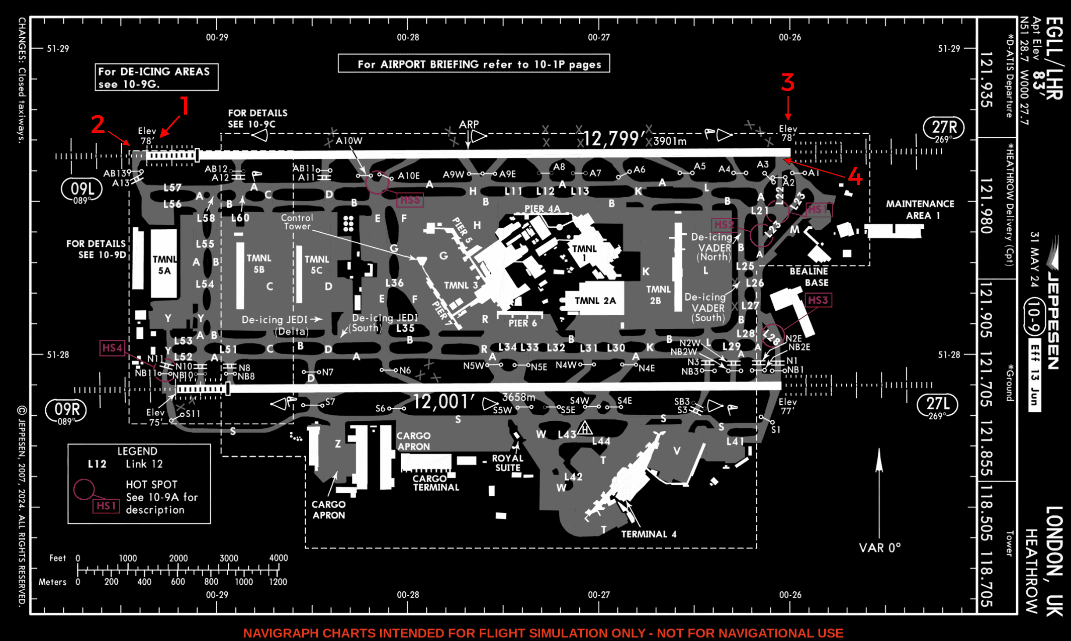 For a large airport like EGLL, there is not enough space to add the additional runway information on the 10-9 chart. In this case, TORA distance for each runway and for intersection takeoffs is provided on the 10-9A chart. For a Runway 09L full-length takeoff, the TORA is 12,799 feet, or 3901 meters.
