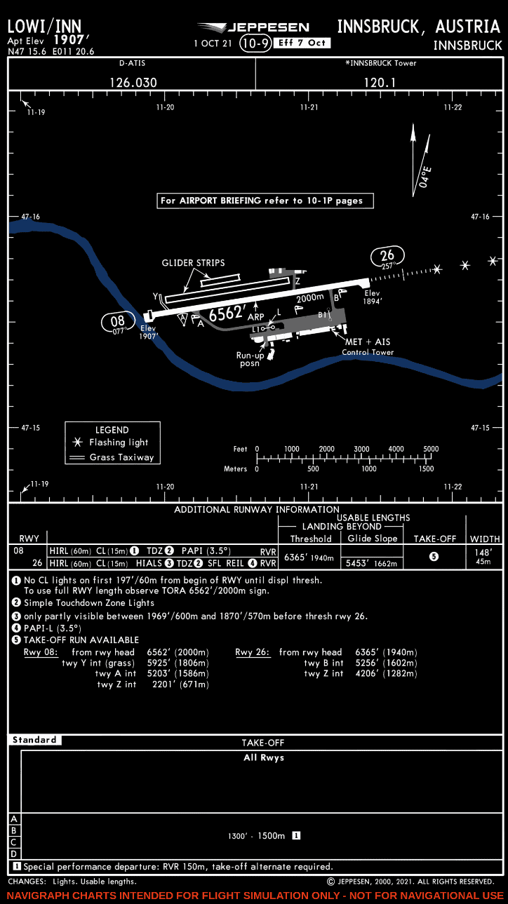 This airport’s 10-9 chart has all the information on one chart. This is an example where both runways have a 180-degree entry angle; that is, the airplane must use the runway to taxi to the runway end and then turn around to use the full runway length for takeoff. TORA values for the full runway length as well as from the taxiway intersections (where a 90-degree entry angle would apply) are listed in the Additional Runway Information section.