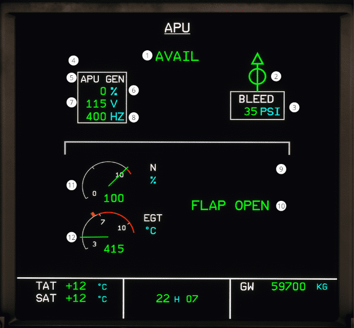 12 APU EGT Green color The APU EGT temperature is within normal operating range.