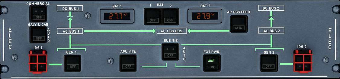 - Switches off all aircraft commercial electrical loads.