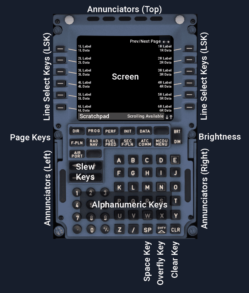 Control the light intensity of the entire MCDU. MCDU power up is performed with the BRT key and MCDU shut down is performed with the DIM key.