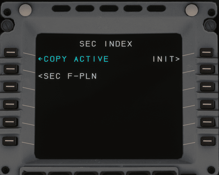The SEC F-PLN key on the MCDU console allows the flight crew to call up the secondary index page and the secondary flight plan page. The secondary flight plan is generally used to prepare a diversion, an alternate routing, for predictable runway changes at takeoff or landing, or for a next flight. More information is available in the SEC F-PLN Feature Guide.