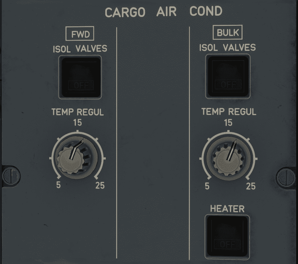 The Cargo Air Conditioning Panel is used to control the air conditioning in the cargo compartments.